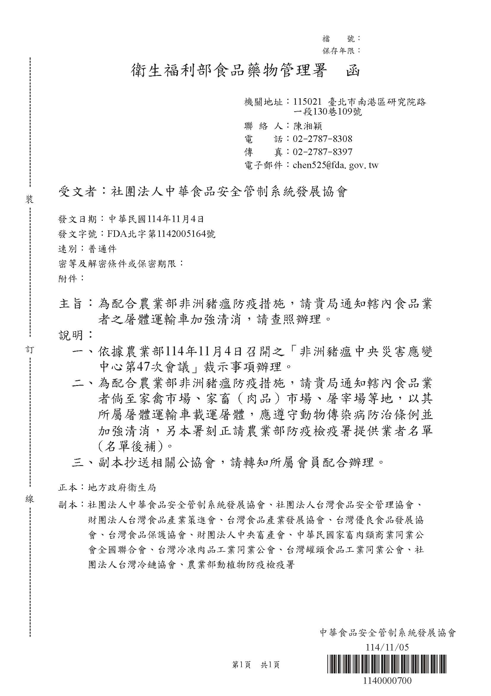 為配合農業部非洲豬瘟防疫措施,請食品業者之屠體運輸車加強清消