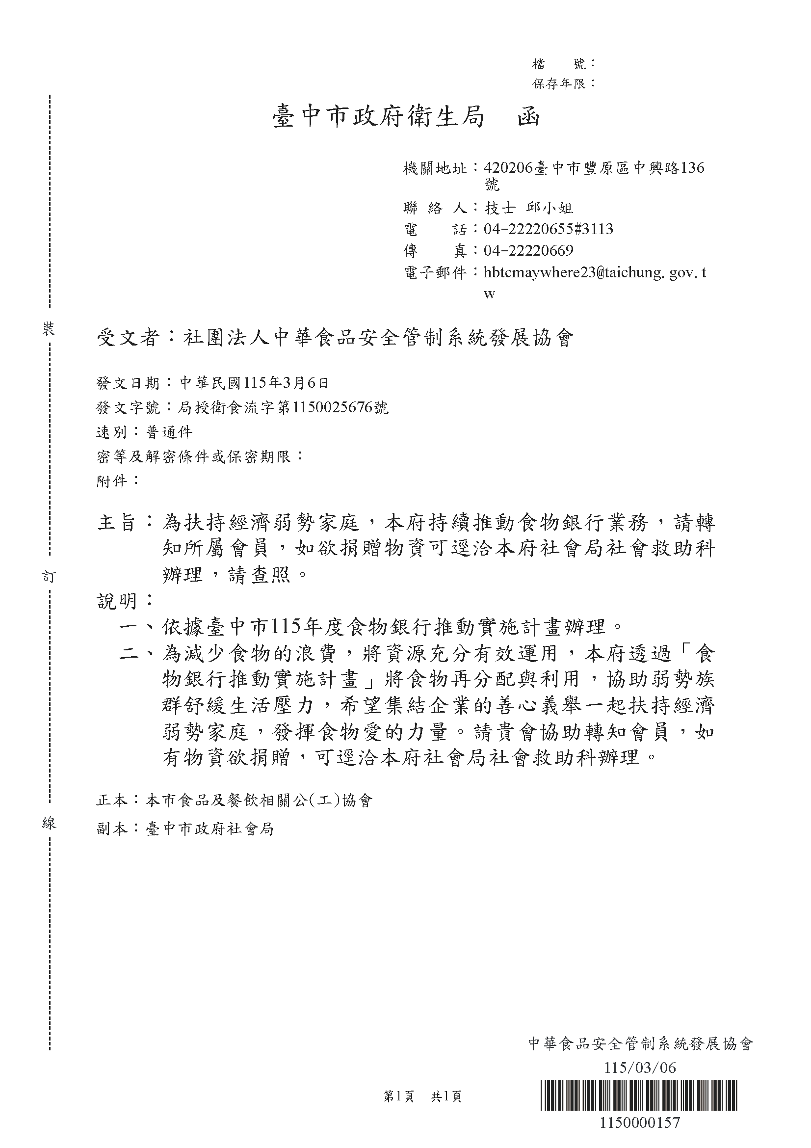 臺中市政府衛生局【食物銀行推動實施計畫】